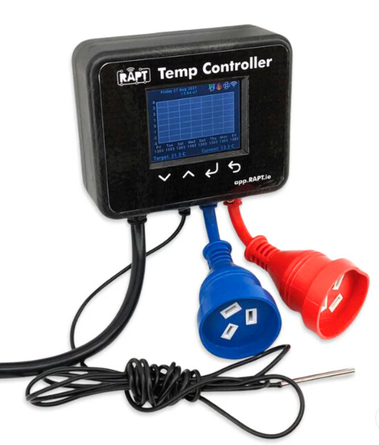 I’ve bought a temperature controller from KegLand in Australia ( RAPT Wi-Fi Temperature Controller Box | KegLand ) (the European model, of course with the correct plugs!) which as far as I can tell uses a temperature sensor to just cut and activate the main power to the fridge (it does have a secondary outlet for a heating pad, but I will not be using that). In the image below, the fridge plugs into blue; the heating pad to red.
