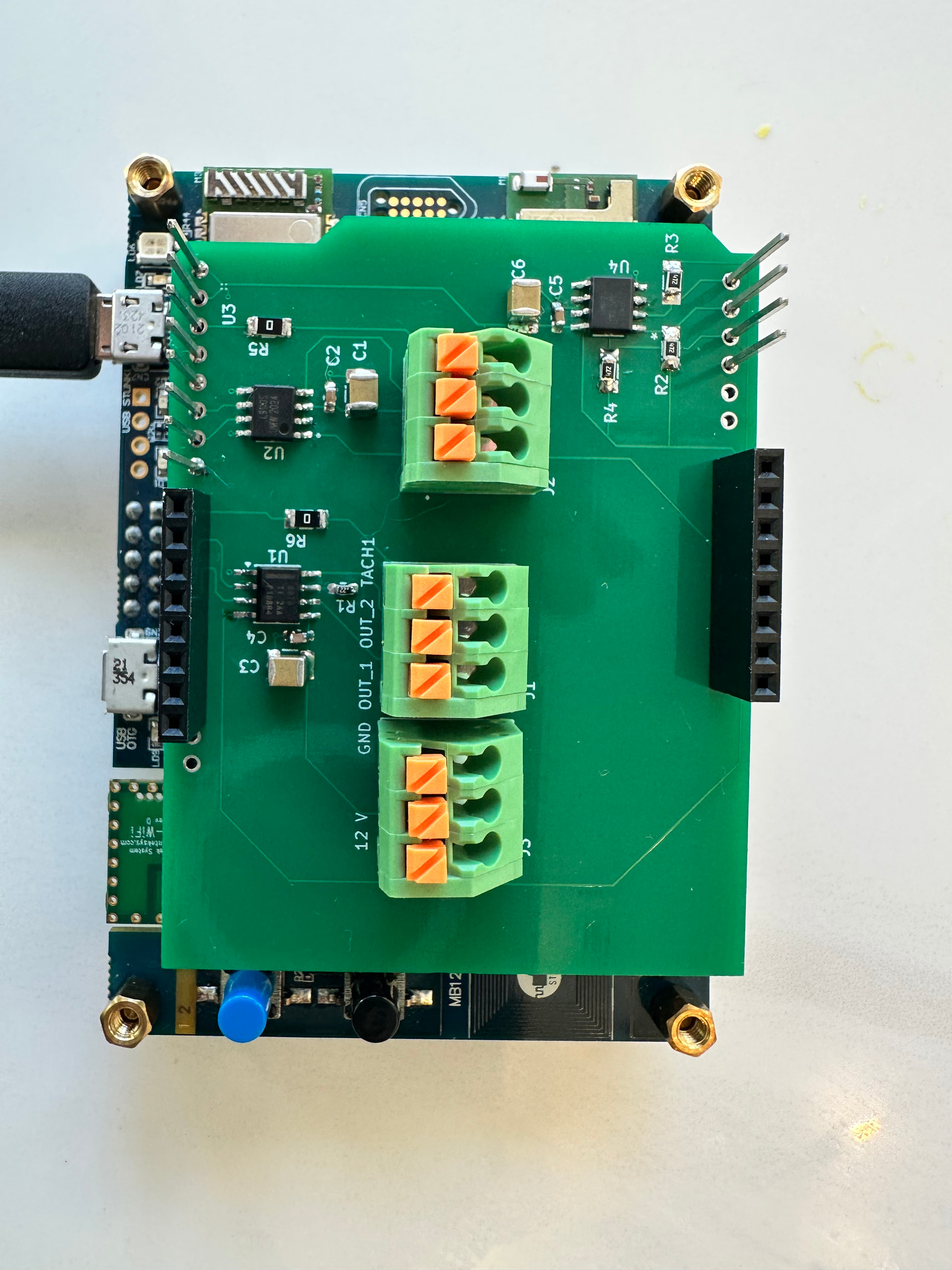 I have assembled the board (see pics below). I have confirmed that 5 V and 3.3 V are available on the shield. Next step is to apply 12 V externally and start to confirm individual modules are operating correctly.